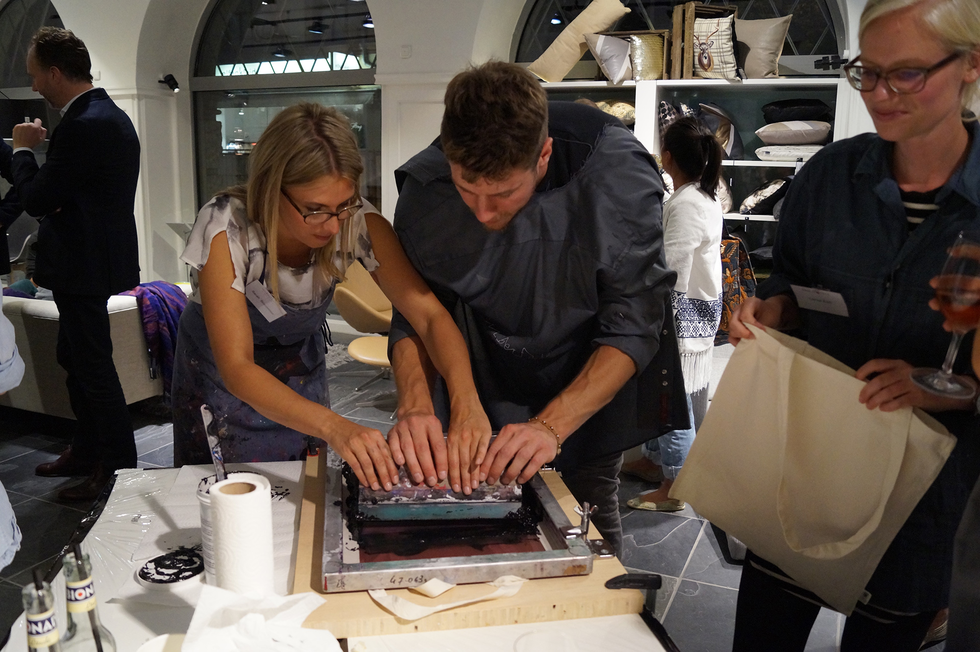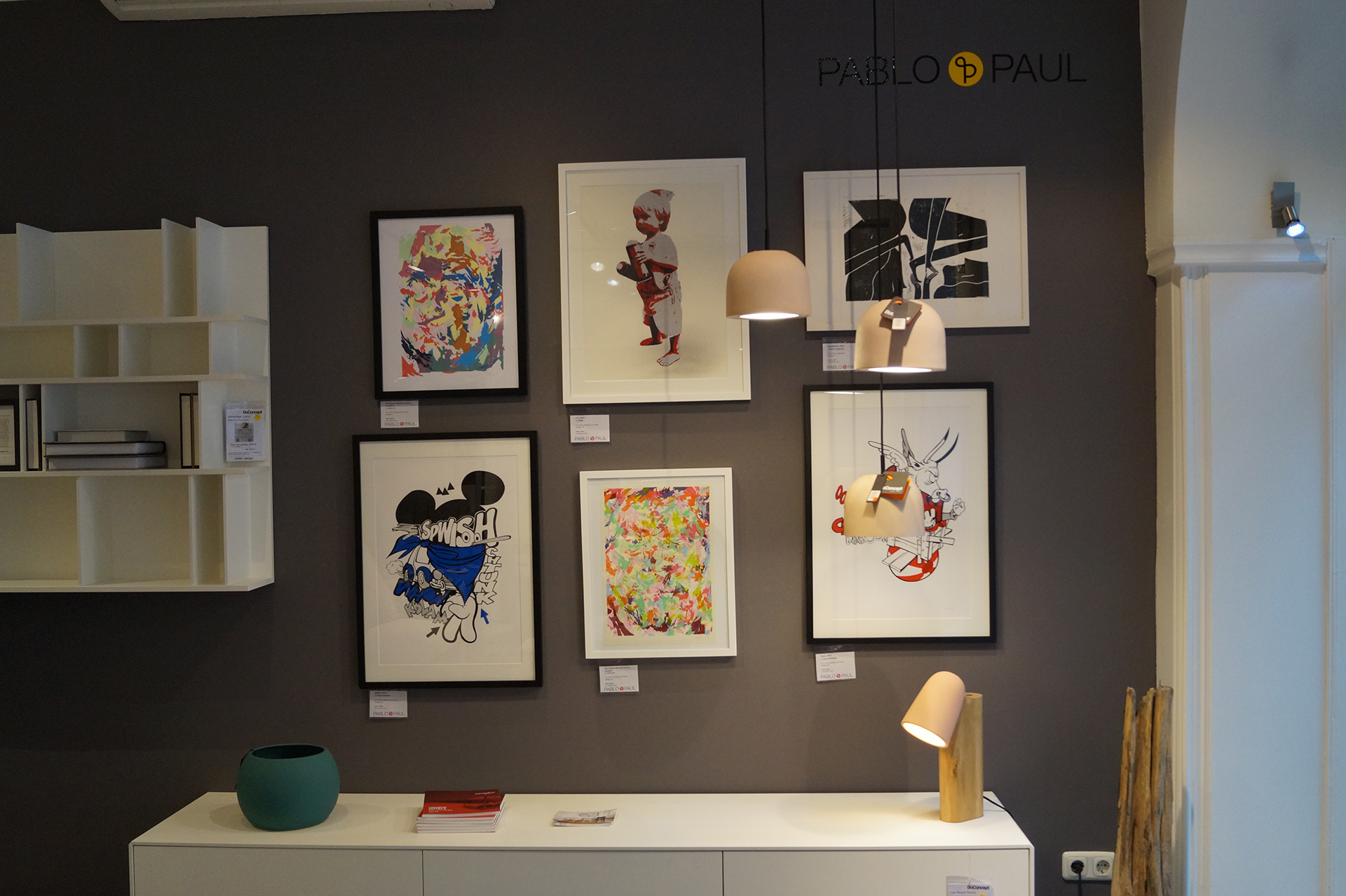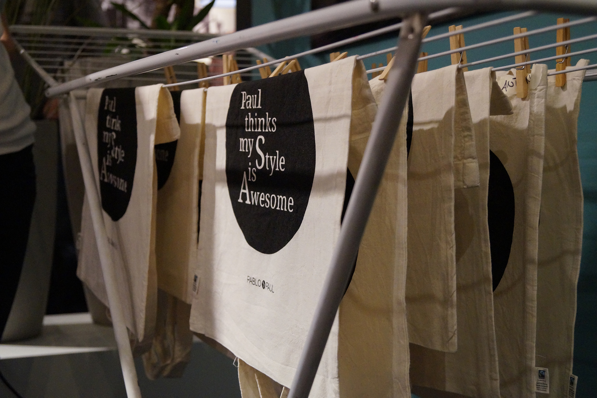 Highlight des Abends war neben der Kunst jedoch die Siebdruckstation neben dem Eingang. Sarah von der Silberfabrik war live vor Ort und druckte zusammen mit den Besuchern stylishe Pablo & Paul Taschen direkt zum Mitnehmen. Jung und Alt waren begeistert von der Aktion und so gingen fast alle der Besucher am Ende des Abends mit einer Paul thinks my style is awesome Tasche nach Hause.