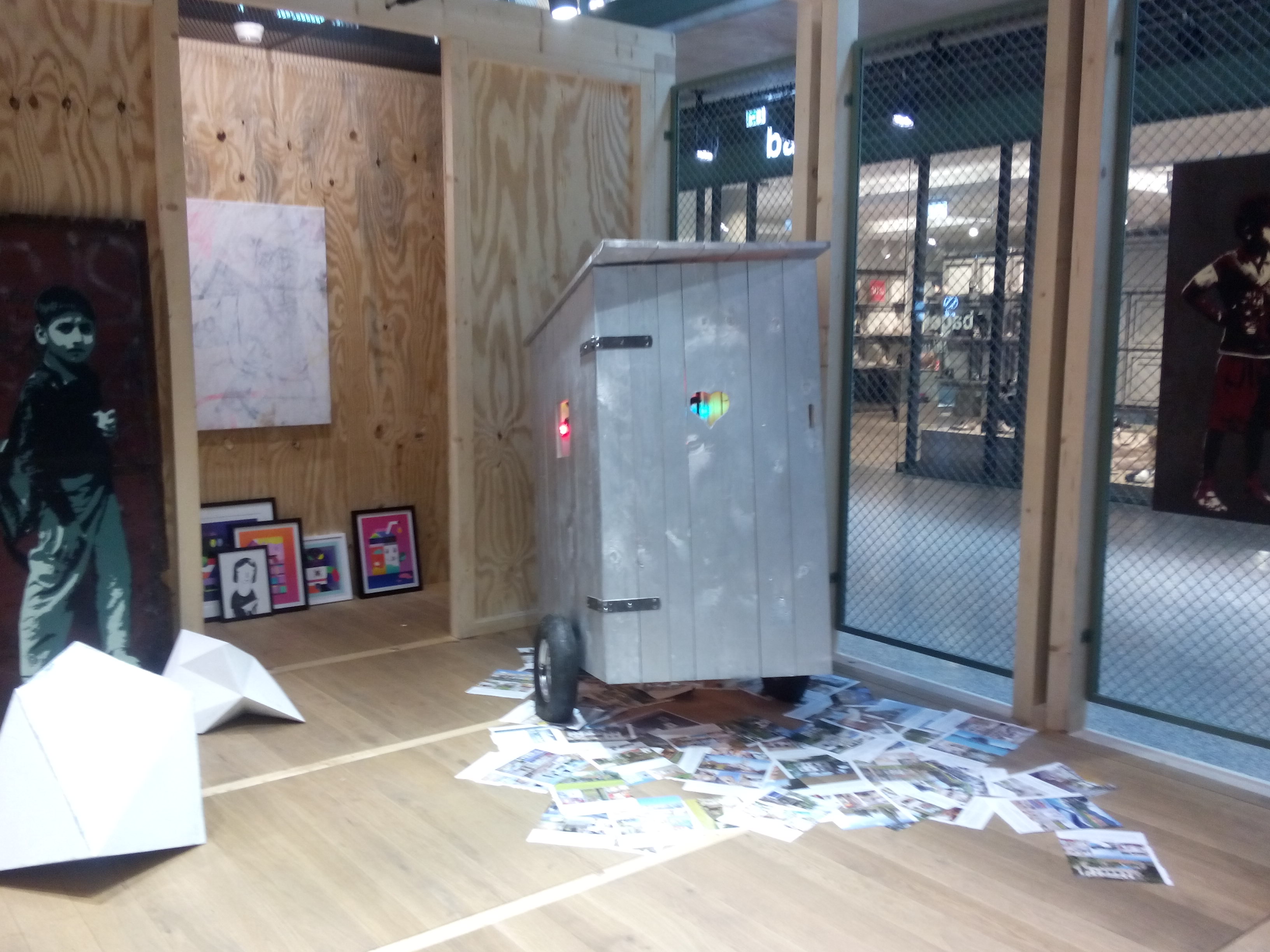 Erst auf den zweiten Blick seltsam anmutende Wachseier stapeln sich in einer Nische und eine Neon-Arbeit von Olivia Steele rät: Stay Present. Dazwischen: Collagen mit heimeligen Gegenständen wie Stühlen und Tischen von Micosch Holland, Sprayarbeiten des Hamburger Street Art Künstlers TONA, Objekte von Marco Reichert und last but not least: ein mobiles Klohäuschen aus dem buntes Licht nach außen dringt von Roswitha Huber.